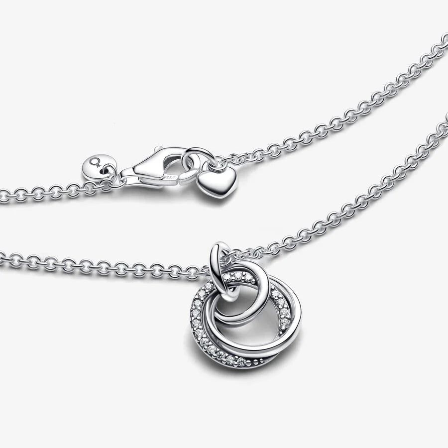 Símbolo de laços inquebráveis, o Colar Family Always Encircled apresenta três círculos interligados no pendente – dois de prata 925 polida e um pavé de zircónias luminosas. O fecho apresenta um pequeno disco em forma de coração com o monograma com o "O" coroado da Pandora num dos lados. O comprimento da corrente é ajustável, tornando esta peça versátil para complementar qualquer conjunto.